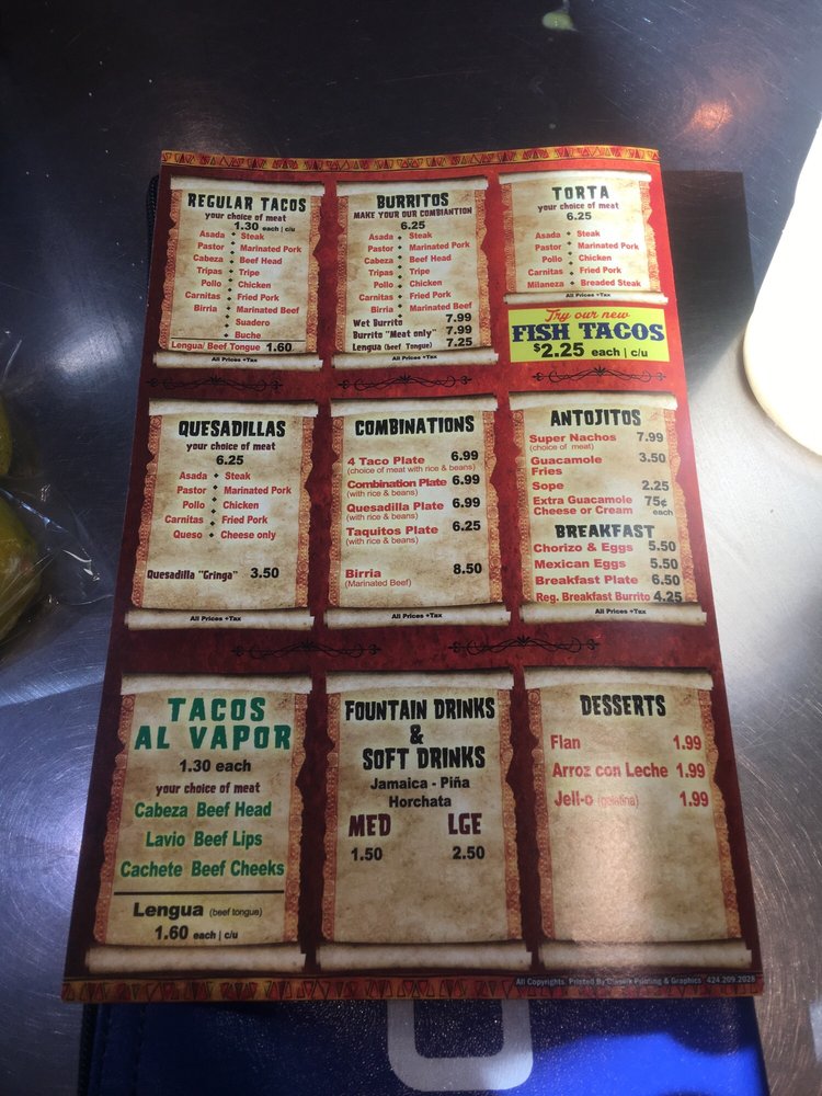 Tacos El Fogon, located in Paramount, CA, offers a diverse menu with a variety of options for Mexican food enthusiasts. Their extensive taco selection includes favorites like Asada, Pastor, and Carnitas, all priced affordably. Noteworthy options like the Birria and Lengua tacos have received high praise from customers for their delicious flavors and quality. The restaurant also offers burritos, quesadillas, and even unique dishes like fries with carnitas. Customers have highlighted the quick and friendly service, along with a relaxed ambiance, making it a great spot for families and groups. With options for vegetarian diners and convenient amenities like outdoor seating and bike parking, Tacos El Fogon is a must-visit for anyone craving authentic Mexican cuisine. Step into Tacos El Fogon and experience the true taste of Mexico right in California.